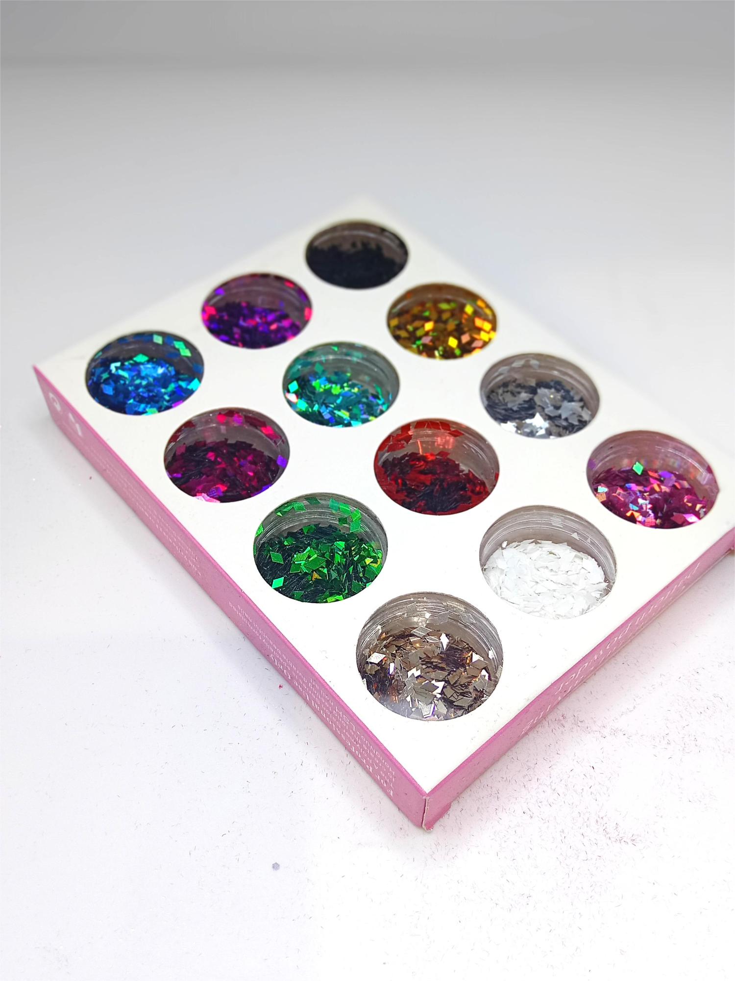 Все имеют неправильную ромбовидную форму. Возможно, использование в технике «битое стекло». Покрывая ногтевую пластину блестками целиком, получается эффект объема, но допустимо и единичное использование в комбинации с другими элементами декора и росписью.