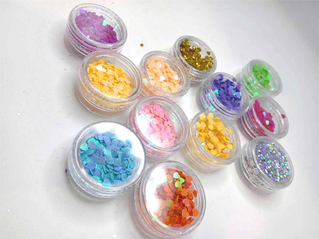Набор включает в себя 12 коробочек, в каждой крупные декоративные блестки в виде сердечек 12 разных цветов. Наносятся на ногти перед финишным покрытием с помощью дотса или тонкого маникюрного пинцета. Цвета блесток можно сочетать. Держатся на ногтевой пластине за счет полимеризации финального слоя гель-лака. Имеют переливающийся блеск. Прозрачные крышечки позволят выбрать мастеру и клиенту нужный цвет для создания эксклюзивного дизайна.