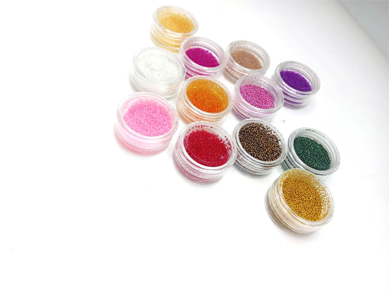Набор разноцветных мелких декоративных шариков бульонок «Икра». Используя этот декоративный материал, на ногтевой пластине получается 3D дизайн. Способ применения: для получения «икорного» маникюра необходимо использовать густой финишный гель-лак без липкого слоя. На подготовленную ногтевую пластину, с нанесенным финишем нужно насыпать декоративный материал, скорректировать его на ногте, используя апельсиновую палочку, дотс или шабер и заполимеризовать в лампе. Для усиления эффекта, можно дополнительно «запечатать» торец ногтя тонким слоем того же финишного слоя. Размер: 0,6-0,8 мм.