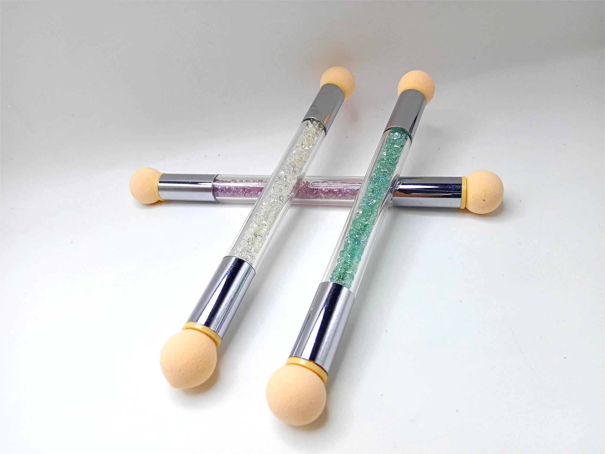 Губка имеет 2 рабочих наконечника, один конусообразный, второй округлый. Ручка декорирована разноцветными фразами внутри. Губка мелкопористая, распределяет краску и гель-лаки равномерно, обеспечивая плавный переход цвета градиента. Очищается специальными средствами для очистки кистей и жидкостями для снятия гель-лаков.