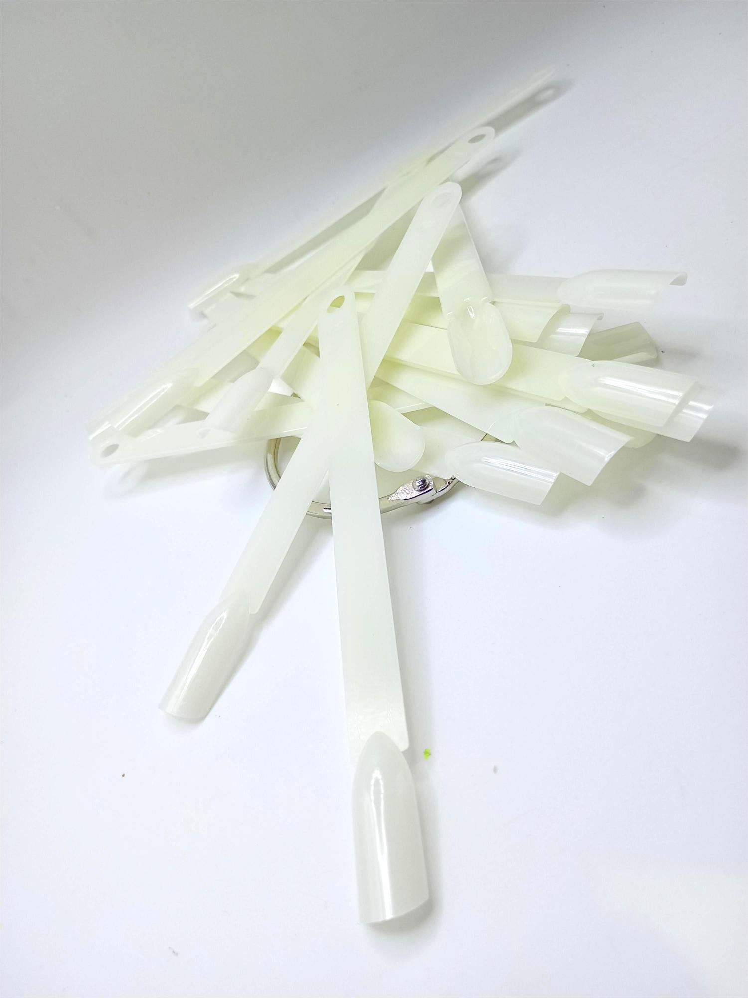 Рассчитана на 50 различных оттенков. Дает клиенту возможность внимательно рассмотреть все цвета и выбрать для себя понравившийся оттенок. В процессе полимеризации в любом виде маникюрных ламп, пластик остается неизменным, не подвержен деформации и растрескиванию. Позволяет просушивать нанесенный материал по одному или нескольким образцам одновременно. Рабочие типсы съемные, размещаются на металлическом кольце. Длина всей типсы 12,6 см, что дает возможность написать номер цвета и фирму изготовителя материала."